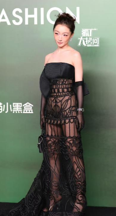 她的另一套黑色透视裙因花纹被戏称为“防盗窗”,搭配夸张眼线和红毯行为