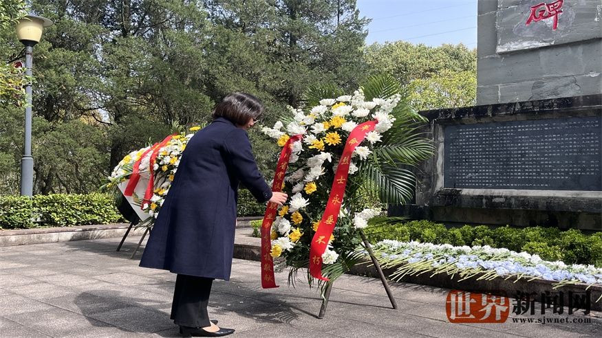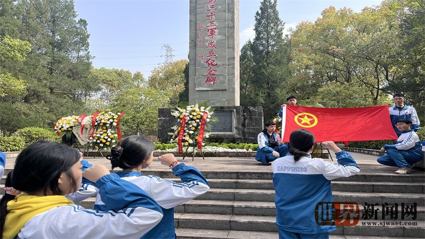 上午10时,红三十三军纪念碑前,气氛庄重而肃穆,全体师生整齐列队。祭扫仪式在主持人的宣布下正式开始,两名学生代表迈着沉稳的步伐,向纪念碑敬献花篮,花篮缎带上“革命烈士永垂不朽”的字样格外醒目,寄托着师生们对先烈的无尽敬仰。学校党委专职副书记康莲随后上前,认真整理花篮挽联,每一个动作都饱含着对先烈精神的尊崇。