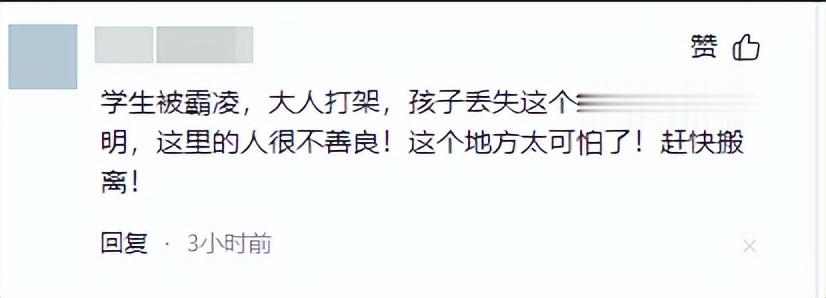 还有网友表示,学生被霸凌,大人打架,孩子丢失这个结果清楚地表明,这里的人很不善良,这个地方太可怕了,赶快搬离。