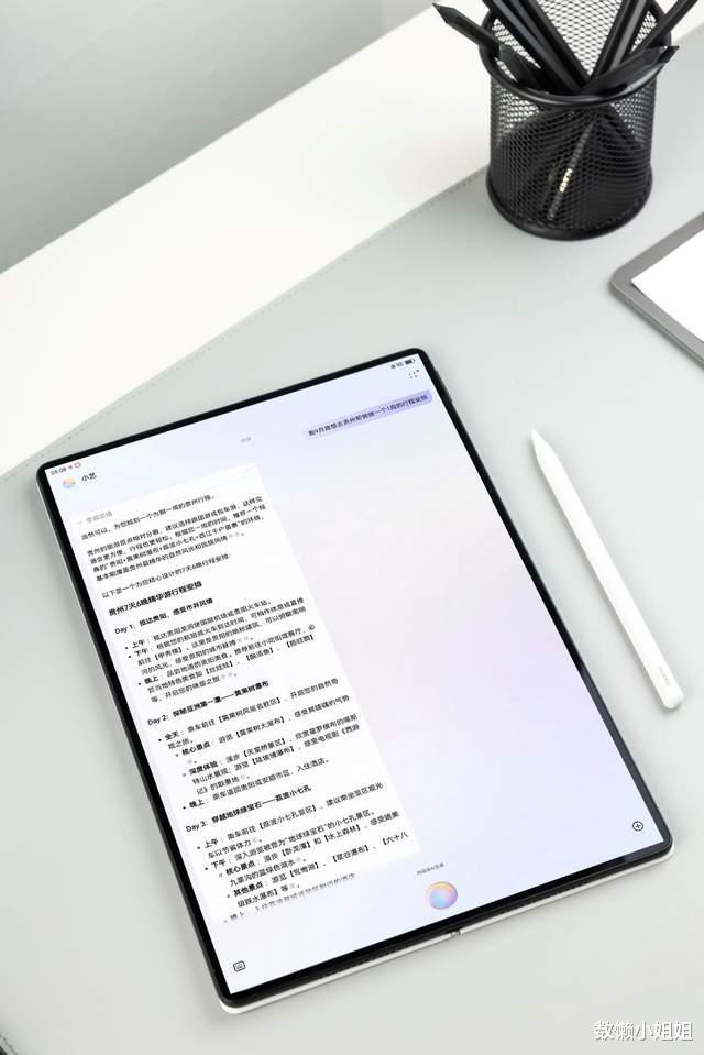 搭配的HUAWEI M-Pencil(第三代),是业界首支超万级压感手写笔,压感细腻,记会议纪要时笔迹粗细随力度变化,像用笔在纸上写一样自然。智能磁吸键盘支持分体使用,在高铁等狭小空间办公时,可把键盘拆下来放腿上输入,支架调整到舒适角度,兼顾实用性和灵活性。