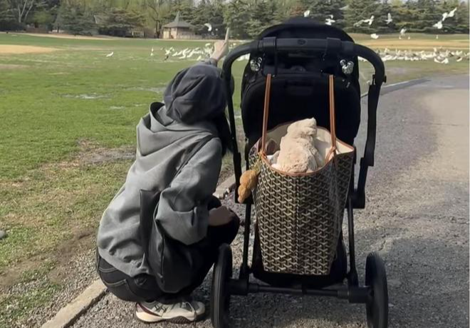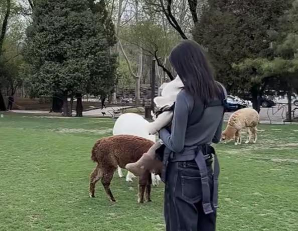 在户外的庄园里,有羊驼还有小马,再加上天气不错,是个适合踏青的好地方,还有很多的鸽子,何穗戴着帽子,穿着灰色外套和黑色牛仔裤,打扮休闲,宝宝坐在婴儿车里,天上鸽子飞过的时候,何穗还指给儿子看。宝宝坐腻了婴儿车,何穗就用背带背着儿子来看小动物们吃草。虽然何穗穿的挺低调的,但是她身材很高挑,又瘦又有气质,还是挺引人关注的。
