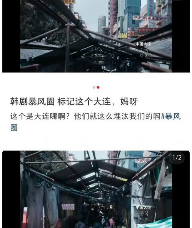 剧中更离谱的还有场景设定,铺在地上被踩来踩去的红色地毯,竟然还带有五角星的图案,还有剧里标注的2025年的大连,结果镜头一给,是破烂漏风的大鹏和房子,街上的破旧大三轮子,以及屋内发黑掉皮的墙壁,再加上故意加的阴间滤镜,直接把东北经济第一城的大连拍成了贫民窟。