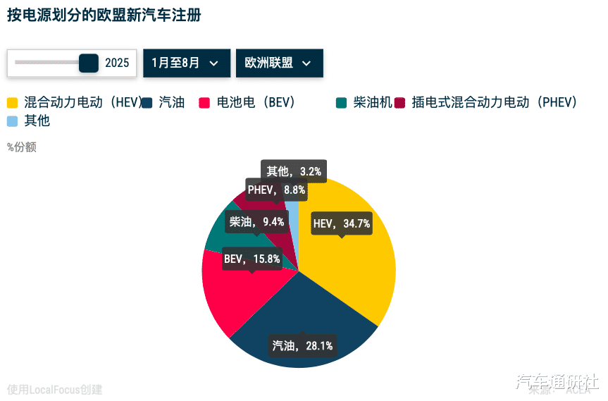 与此同时,欧盟范围内混合动力汽车(HEV)占据了34.7%的市场份额,是最受消费者欢迎的动力类型。8月欧洲插混汽车的同比增幅更是达到54.5%,已实现连续六个月猛增。