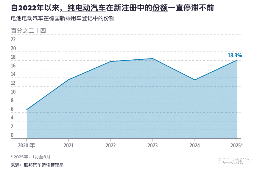 德国作为欧盟最大的电动汽车市场,1-8月电动汽车销量增幅达到了39.2%,是欧洲市场之最。然而,德国电动汽车的市场份额自2022年始终处在18%左右。