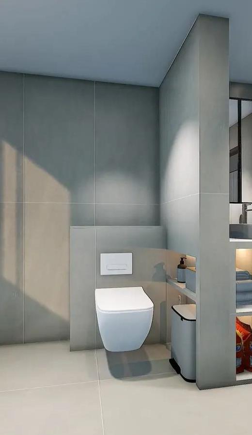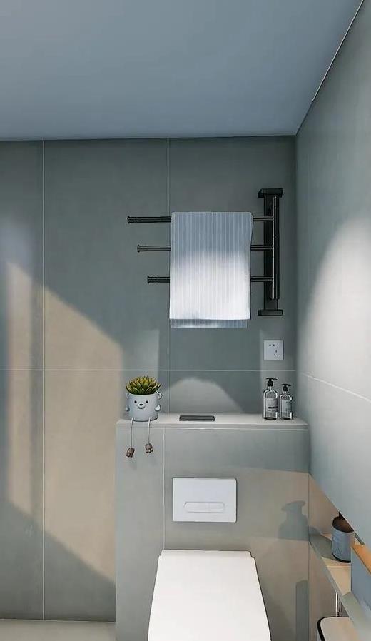 提前精准预埋水箱,安装壁挂式马桶,在台面预留检修口,为后期维护提供便利,上方配置电热毛巾架,抑制细菌滋生,保持毛巾干爽洁净。