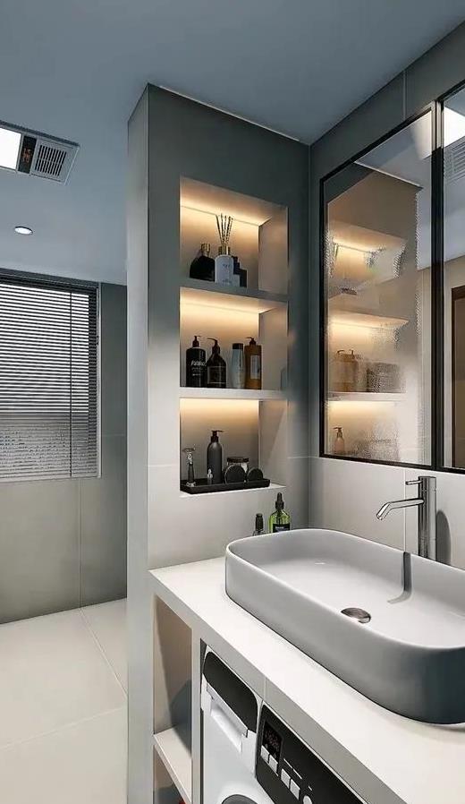 摒弃昂贵且未必贴合需求的成品洗漱台与镜柜,采用红砖砌墙工艺,精心挖出壁龛,各类洗漱用品放置其中,拿取便捷。