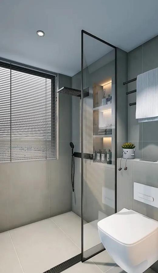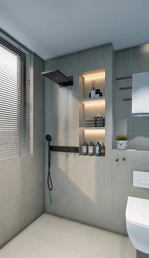 淋浴区包管砌墙打造壁龛,沐浴用品轻松收纳,入墙式花洒增添美观与高级感。