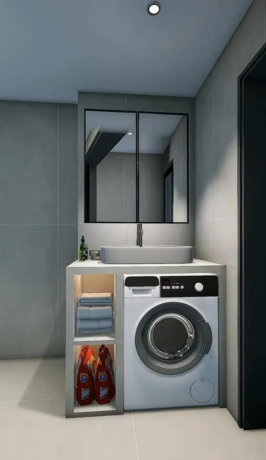下方砖砌的洗漱台坚实耐用,有效防潮,还能巧妙嵌入洗衣机,实现空间的高效整合。