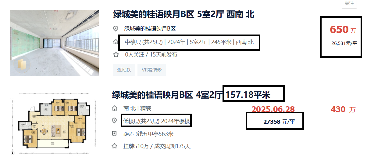 打开二手平台,项目的楼王245平,挂牌单价都在2.4W-2.6W。