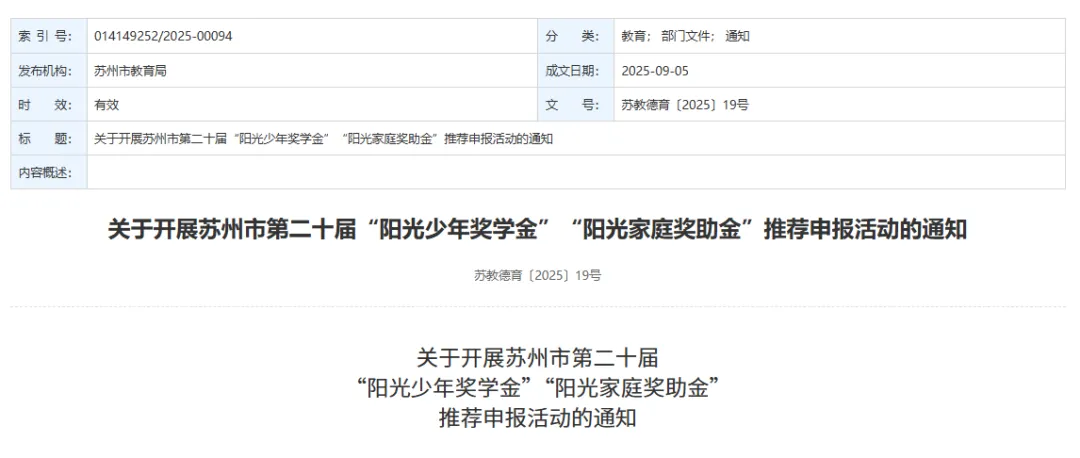 正文内容:(来源-苏州市人民政府)各县级市(区)教育局(教体文旅委),各直属(代管)学校:为了更好贯彻落实立德树人根本任务要求,进一步推动《中小学德育工作指南》各项工作落实落细,努力培育和践行社会主义核心价值观,进一步倡导“成长比成绩重要,成人比成才重要”理念,经研究,今年将开展“阳光少年奖学金”“阳光家庭奖助金”推荐申报活动。有关事项通知如下: