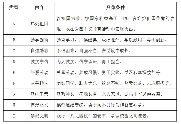 1、阳光少年奖学金:热爱祖国、富有爱心、勇于担当、积极实践、青春阳光,传递正能量(小学四年级及以上未成年人)。