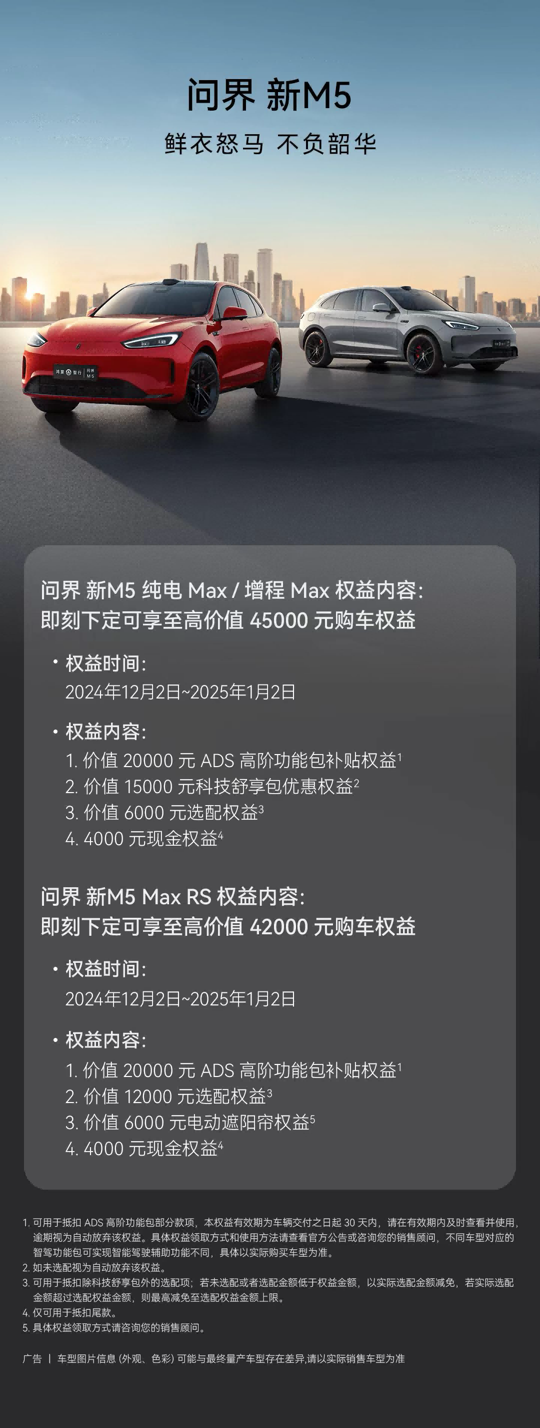 元旦将至,买新焕新正当时。日前,问界新M5在售价24.98万元起的基础上还带来优惠的购车福利:即日起至2025年1月2日期间下定问界新M5纯电Max、增程Max,享至高价值45000元购车权益,包括价值20000元的 ADS高阶包抵扣券、价值15000元科技舒享包优惠权益,价值6000元选配权益以及价值4000元现金权益;下定问界新M5 Max RS享至高价值42000元购车权益,包括价值20000元的 ADS高阶包抵扣券、价值12000元的选配金、价值6000元电动遮阳帘权益以及4000元现金权益。进一步降低购车成本。此外,价值4000元的智驾无忧服务权益延续至12月底。