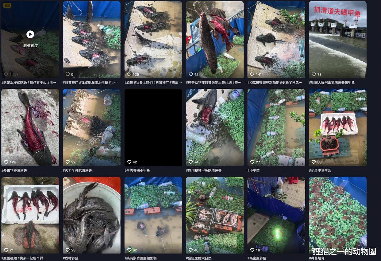我翻了一下博主的主页,他本身就是养殖甲鱼的,最早在9月9日就发布了把清道夫鱼皮切了喂甲鱼的视频,发了好几个流量都一般,也就是这个爆了,获得了1.3万的点赞。我估摸着就是那条清道夫突然扭那一下子带来的震撼给了这个视频流量。