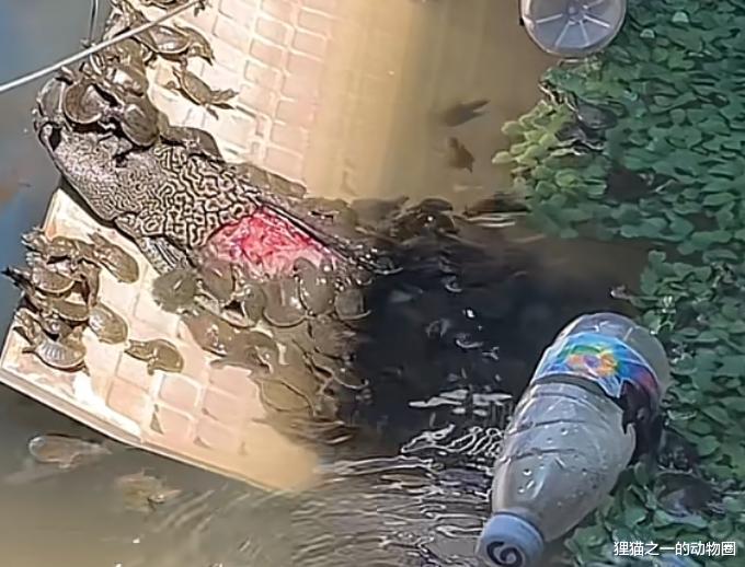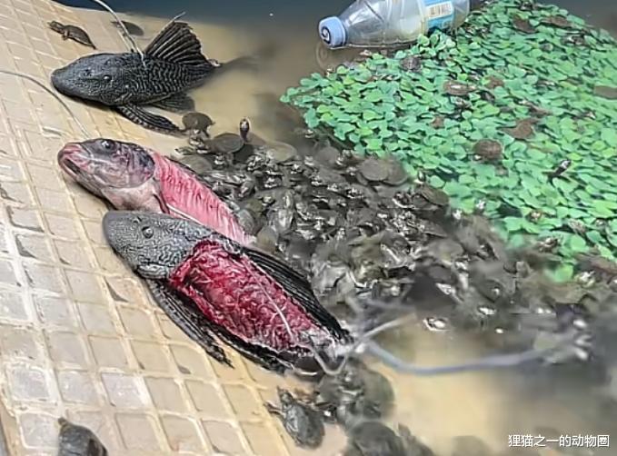 看着就是在喂养甲鱼吧?虽然红色的鱼肉不太好看,也没啥大不了吧?问题是这条清道夫突然猛地扭动身体撞向身旁的鲤鱼,但很快就停止了活动。至于甲鱼们,它们才不管这哪的,吃就完事了。