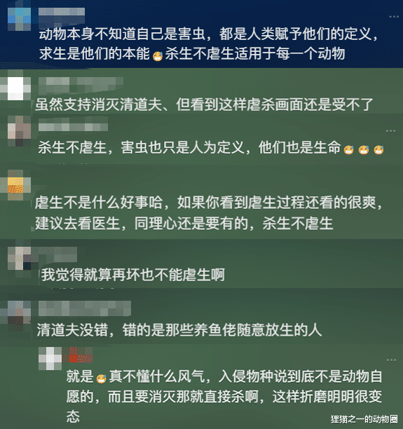 说“不该虐生”的网友提到了一个观点,就是清道夫是被人类主动引入,也是被人类丢弃才变成入侵物种的,因此一切源头都是那些让清道夫进入自然水域的人的错,清道夫只是为了活着。如果出于保护环境的目的去杀了清道夫,那太合理了,但如果是这样的“虐杀”,那就是为了博眼球。