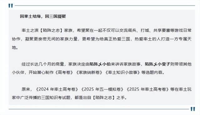 而这恰恰是“陷阵之志”的目的,他们就是这样一群热爱三国历史的玩家,比起在SLG游戏中攻城拔寨,他们更想在游戏中结交同样热爱三国历史的其他玩家,《率土之滨》只是正好符合他们的需求,所以他们才会在率土出题招新。