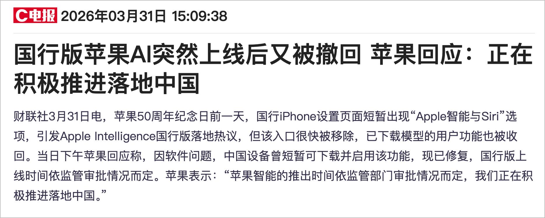 而据财联社下午的报道称,当日下午苹果回应称,因软件问题,中国设备曾短暂可下载并启用该功能,现已修复,国行版上线时间依监管审批情况而定。苹果表示:“苹果智能的推出时间依监管部门审批情况而定,我们正在积极推进落地中国。”