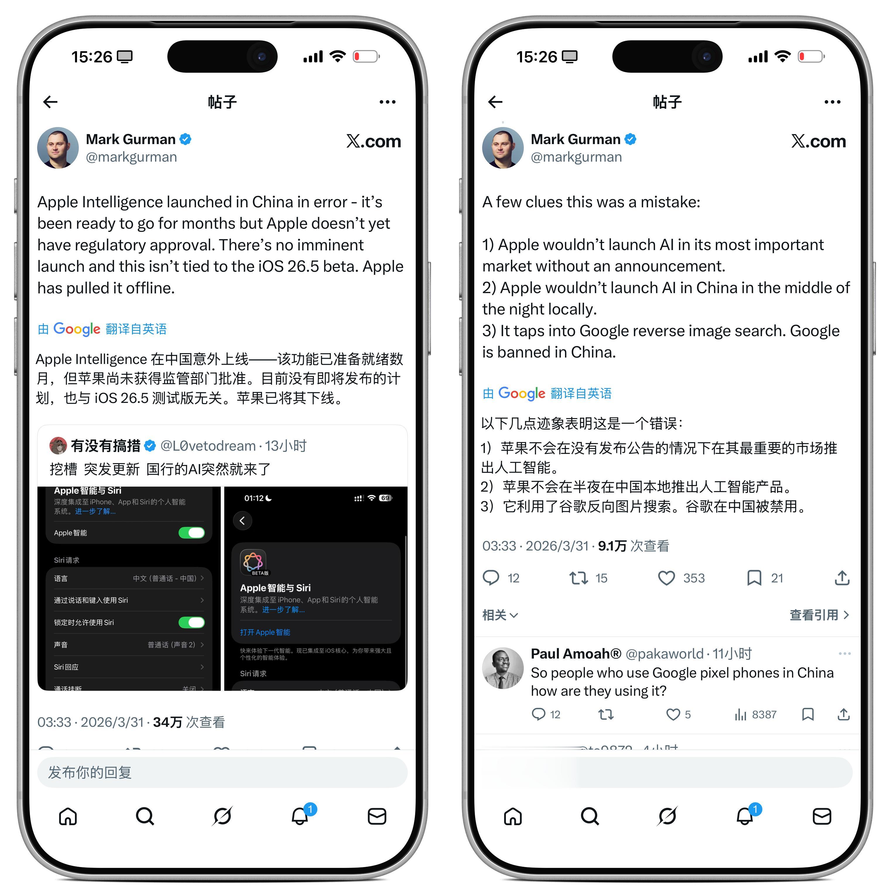 知名记者 Mark Gurman 也在凌晨推文中指出,Apple Intelligence 在国内是一次意外上线,功能虽已准备数月,但尚未获得监管批准,并已与 iOS 26.5 测试版无关。苹果已将入口下线。