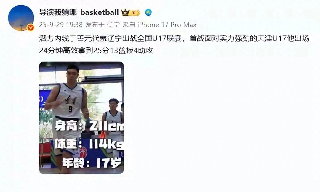 据国内媒体人透露,潜力内线于善元代表辽宁出战全国U17联赛,首战面对实力强劲的天津U17,于善元出战24分钟,高效的拿下了25分13个篮板4次助攻的数据。这对于辽篮来说是一个极大的好消息,因为他们找到下一个韩德君了。
