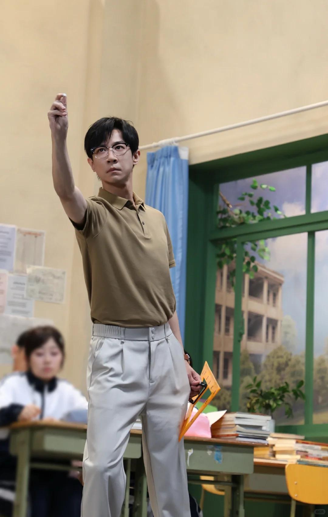 POLO衫、休闲西装裤,搭配一副黑框眼镜——他往教室场景中一站,瞬间化身自带书卷气的斯文"男老师"。灯光朦胧,侧脸专注,手边还摊着一本历史书,氛围感直接拉满。网友纷纷调侃:"突然理解董璇为什么这么迷他了!"