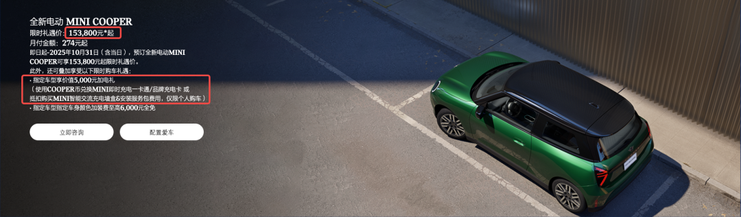 相较老款,新款电动MINI COOPER的起售价上调5000元,去年12月电动MINI COOPER E经典派的限时礼遇价为14.88万元。值得一提的是,虽然官方称之为限时礼遇价,但实际上这样的价格一直都有。