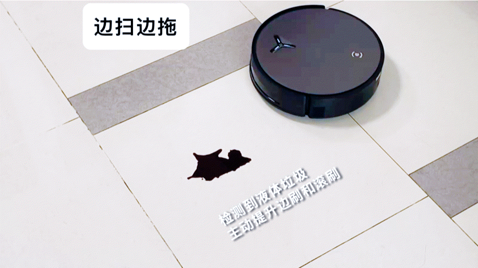 不小心洒了一地液体的情况,以前都得使用一大包纸巾来擦拭,现在都可以交给科沃斯X11 PRO,可以看到它的智能识别处理方式:
