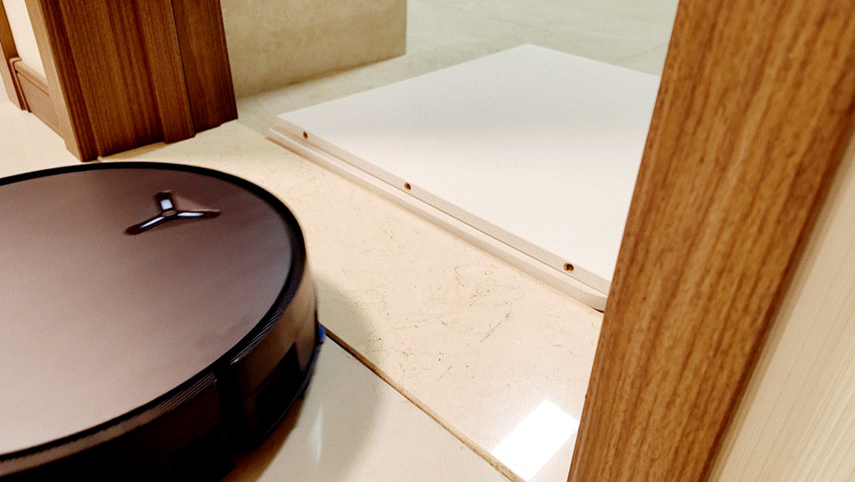科沃斯X11 Pro的越障能力十分出色,对于各房间之间的小门槛跨越更是十分轻松无阻。用两块模板模拟搭设了4cm高度的门槛和障碍,也是轻松成功翻越。