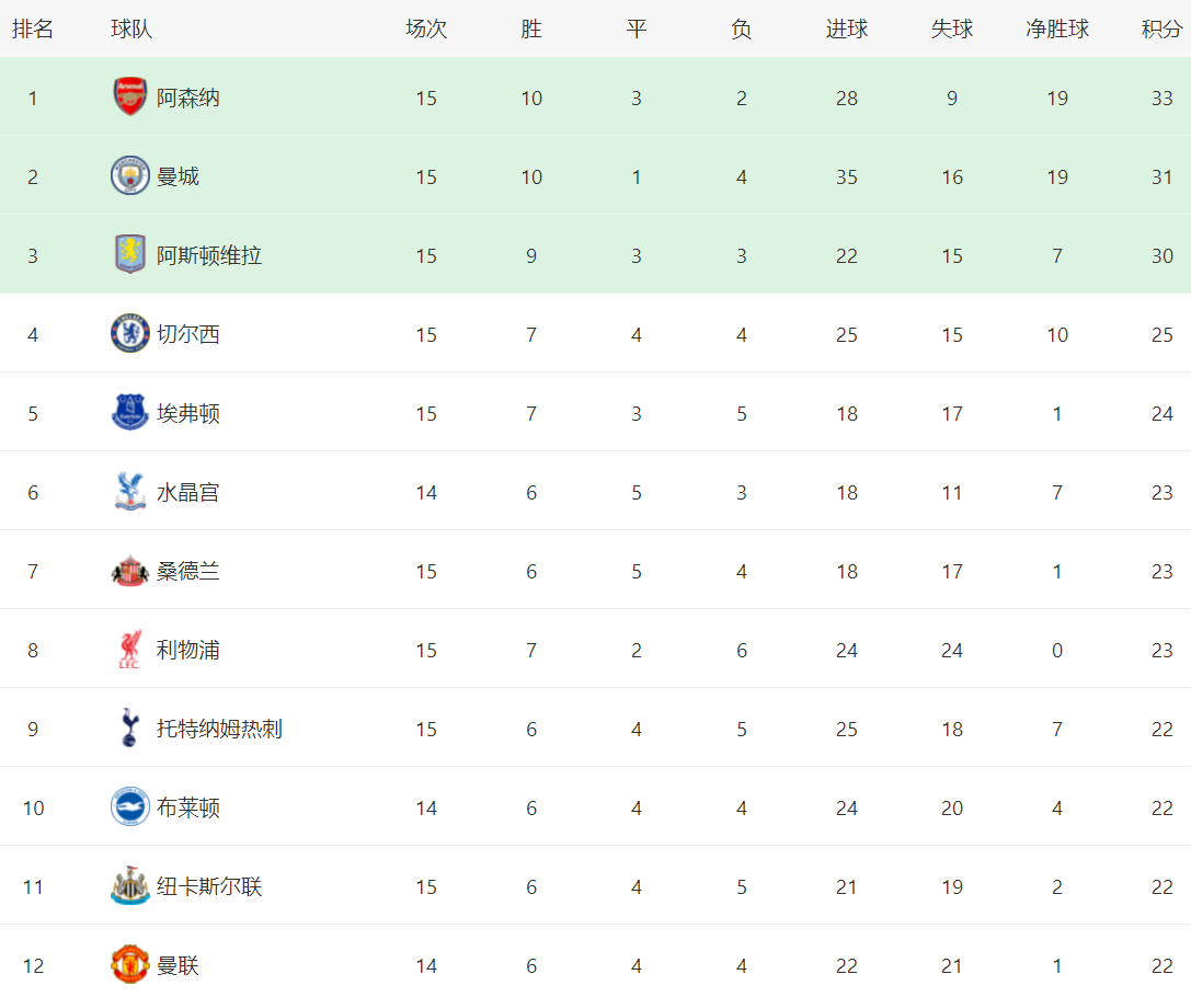在积分榜上,阿森纳总积分依然是33分,排名榜首,但是优势已经所剩无几了。曼城赢球之后,总积分达到31分,排名第2,只比阿森纳少2分。阿斯顿维拉30分排名第3。第4的是切尔西,拿到25分。埃弗顿24分排名第5。水晶宫、桑德兰和利物浦都是23分。