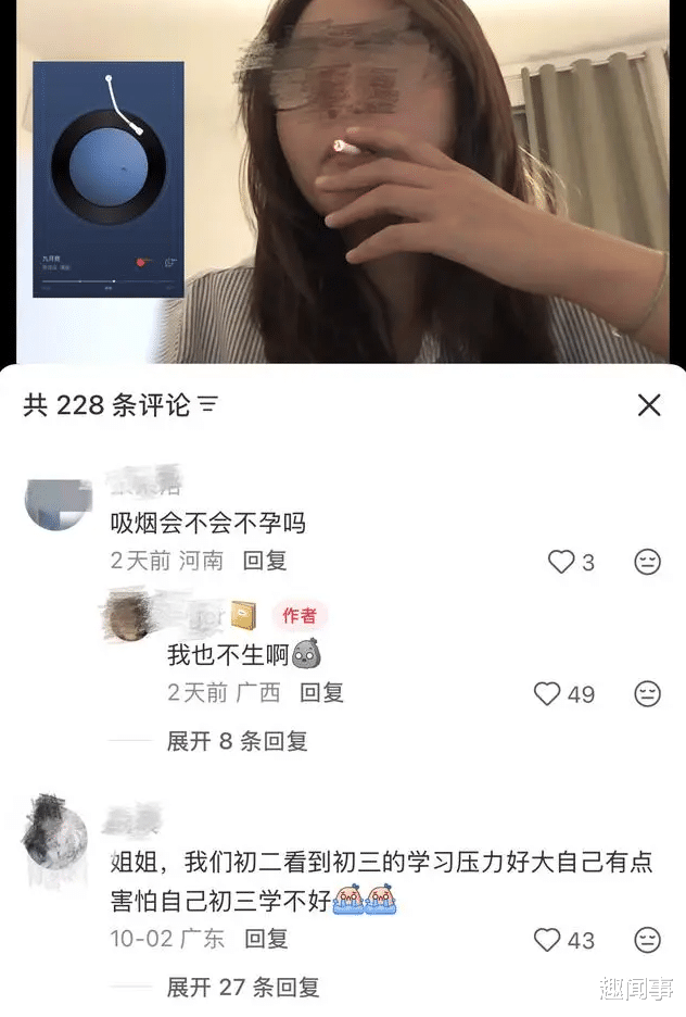 晚上十一点,李女士像往常一样查看儿子的手机,突然被一条视频刺痛了眼睛——昏暗灯光下,一个年轻女子叼着烟,配文写着“3支烟,5首歌,22分钟的陪伴”。更让她心惊的是,儿子在评论区留言:“姐姐,我们初二学习压力好大,害怕初三撑不住……”而博主竟回复:“抽一根解千愁。”