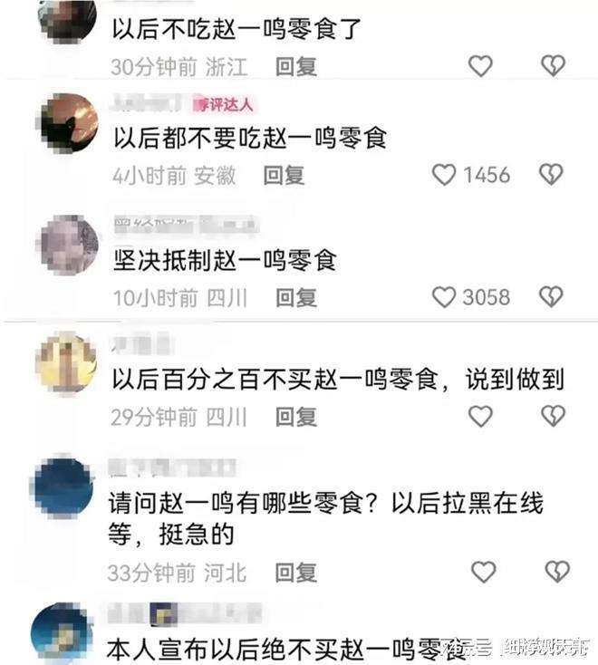 就是这样的一个行为迅速在互联网上引起了惊涛骇浪,从相关的评论区可以清晰的看到,网友们言之凿凿的说要抵制赵一鸣零食,以后都不要吃这家企业的零食。