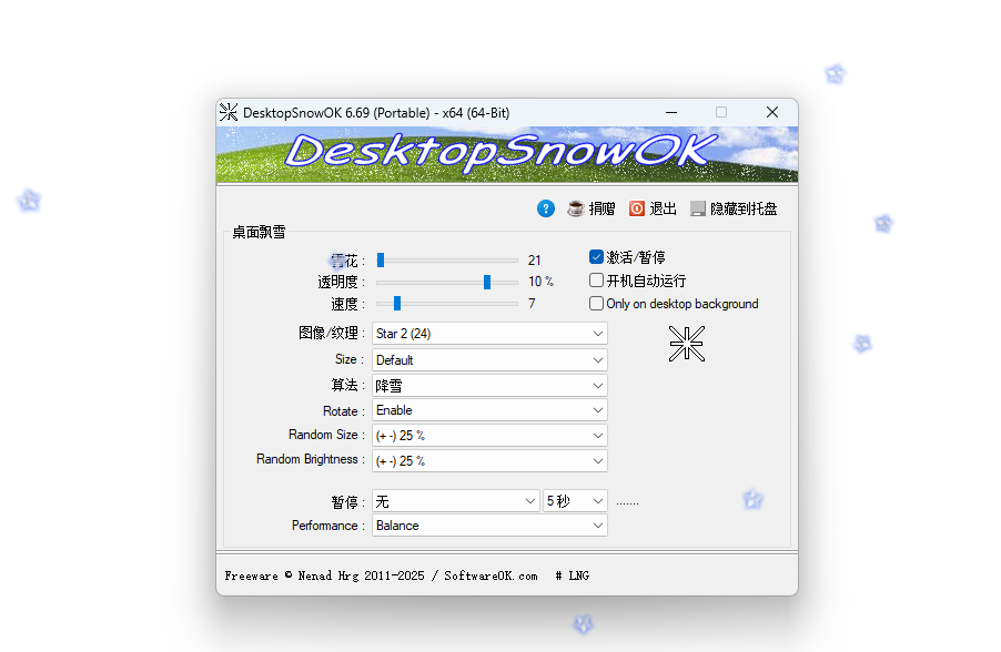 DesktopSnowOK 是一款极简轻巧的桌面动态效果工具,无需复杂操作,即可为你的屏幕增添浪漫与趣味。