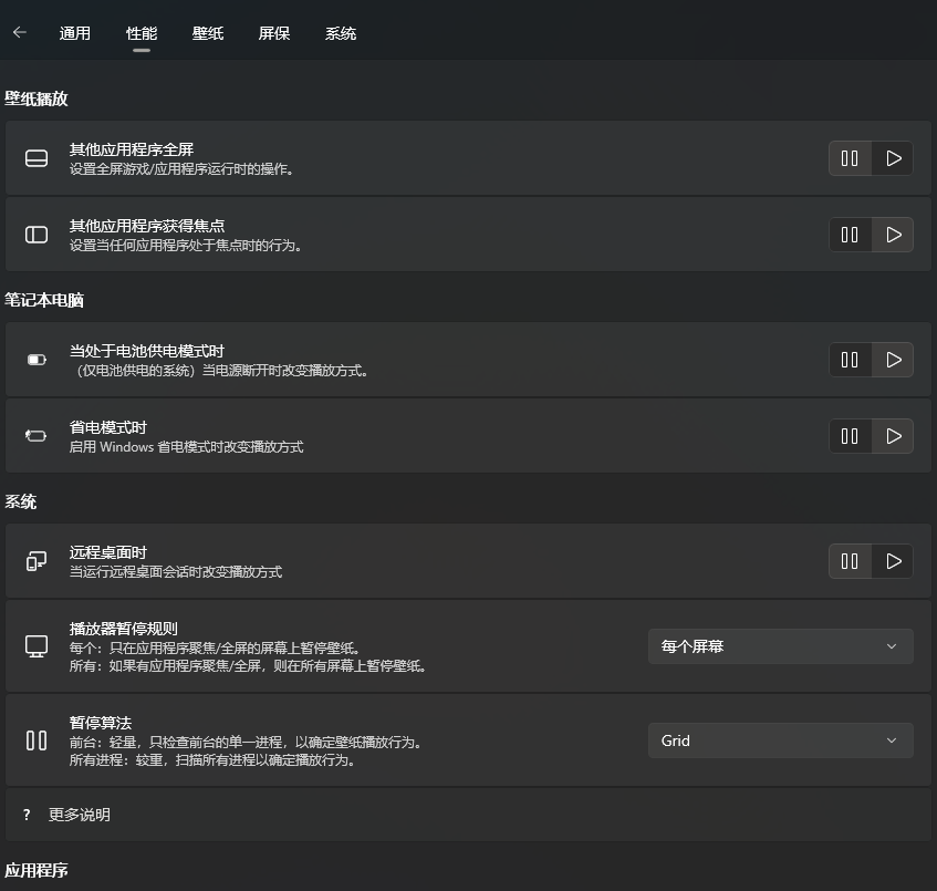 支持暂停/恢复壁纸在全屏应用时自动优化性能;可后台静默运行,不影响日常使用;支持多显示器配置。