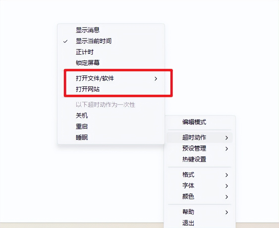 多种超时动作可选:弹出通知、播放声音、锁屏、关机/重启、打开指定文件或链接
