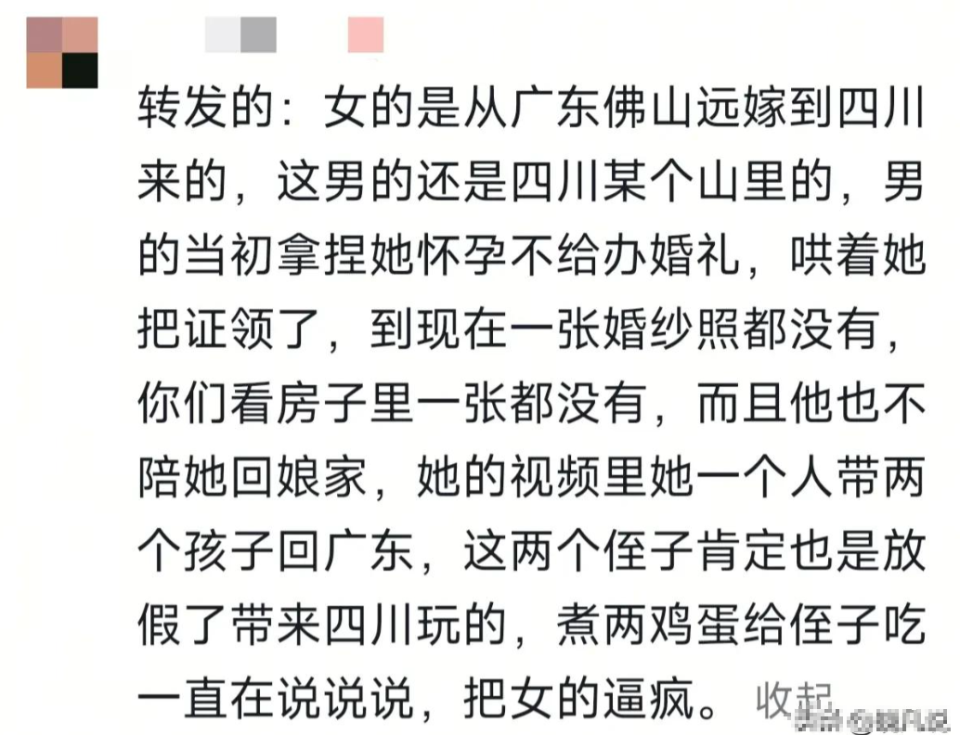 其次,网友们都在讨论远嫁的问题。广东女子嫁到四川,距离确实遥远,真正受了委屈时,娘家连个倾诉的人都没有,也无法及时给予帮助。
