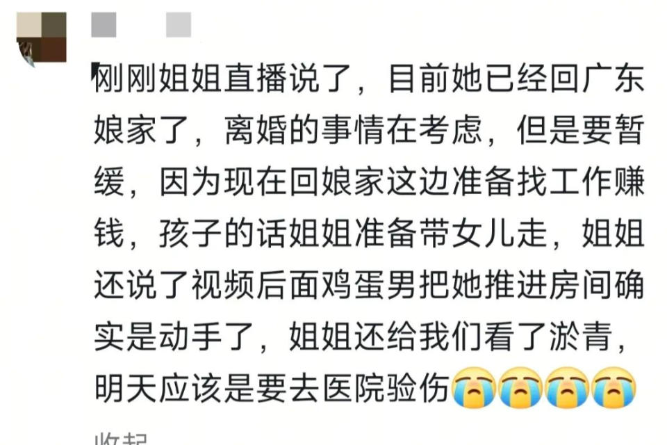 据知情人透露更多细节:视频下方的第一条留言,应该来自女方家人。她表示,女主人已经回到广东娘家,在这起事件之后,男子在房间内对女主人动了手,目前正在考虑离婚,准备去医院验伤。