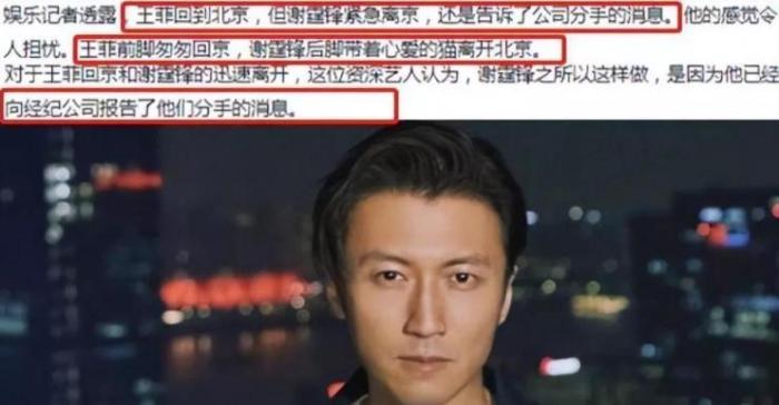 据悉,谢霆锋以分手为由突然带着心爱的猫独自离开北京,据悉他已告知公司两人分手,并回香港与家人见面。但状态萎靡憔悴,似乎有伤心事。另一边,王菲被拍到与小鲜肉约会,两人举止亲密,被传有新欢,证实分手可能。