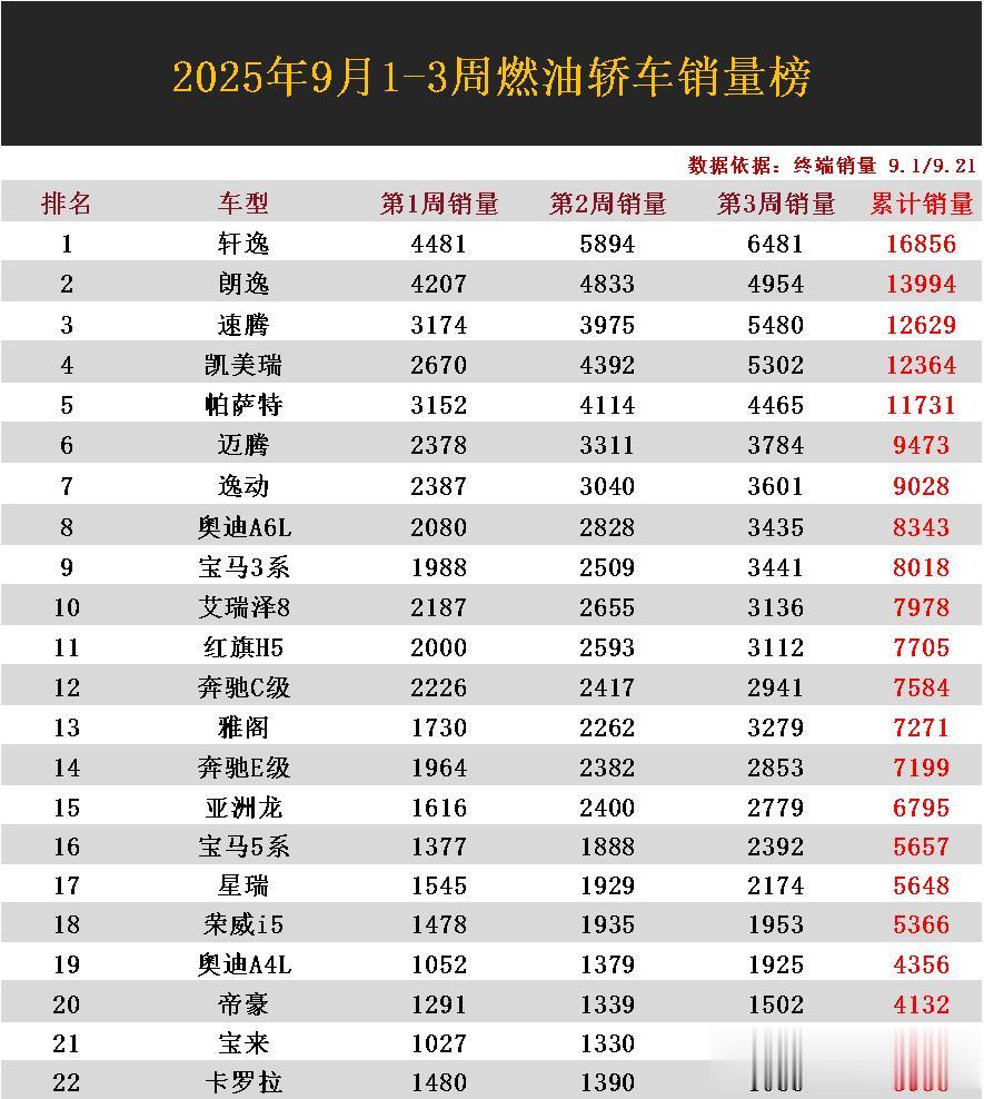 导读:在新能源渗透率持续飙升的背景下,传统燃油车市场内部竞争也已进入了白热化阶段。据最新发布的2025年9月1-3周燃油轿车终端销量数据显示,市场竞争格局呈现出明显的层次与动态变化。其中头部阵营地位相当坚挺,比如:轩逸、朗逸、速腾等常青树销量稳固,其领先的地位可能短期内难以撼动。而中段竞争激烈,丰田凯美瑞成功逆袭大众帕萨特位居榜单第4,成为B级燃油车市场的销量冠军。大众迈腾(第6)虽名列前茅但累计销量未能突破万辆,属实有点遗憾。主打性价比的国产车长安逸动成功守住榜单第七名,奥迪A6L、宝马3系仍然是豪华车市场的销量一哥,排名分列第8-第9名,而艾瑞泽8表现也是十分出色,排名再次出现在榜单前十名以内。