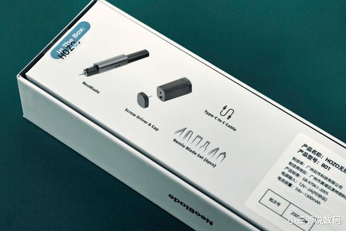 包装内收纳紧凑,除了切割刀外,还附送了多种规格的刀片和充电线、说明书。