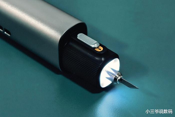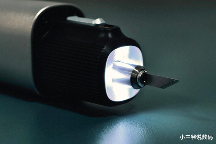 在细节方面的设计,充分体现出了厂商对于用户体验的关注。首先就是在刀片两侧加入了两个LED灯,这样在光线较暗或是处理微小部件时,能够提供充足均匀的光照,避免因视线不佳而导致的切割失误,让我们在任何时间、任何环境下都能专注地进行创作,无需担心因光线问题而影响作品的质量;其次就是长时间切割时,我们可以向后拨开关,进入持续切割模式, 无需按压开关即可连续工作,操控感会更好。