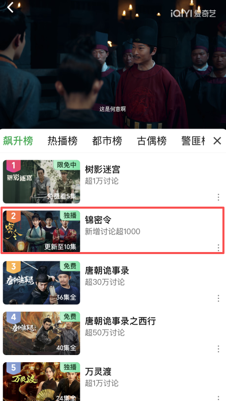 《锦密令》上线桃厂,开播就斩获站内飙升榜第二,热度直逼影帝廖凡主演的《树影迷宫》。