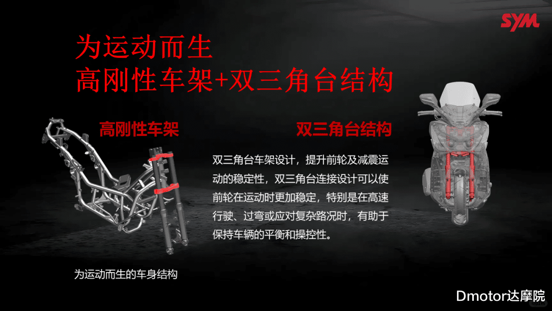 巡弋400用了Max SYM400同款发动机以及同款双三角台结构刚性车架,保证它用料核心车架和动力方面都采用进口方面技术。