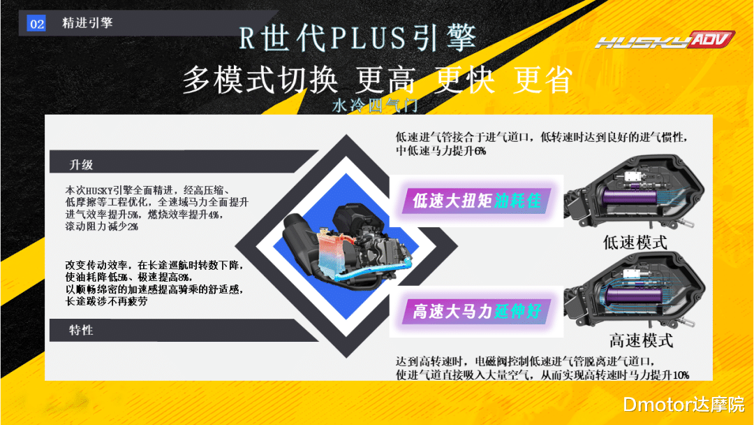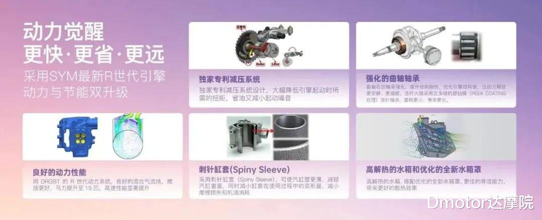 它也搭载了三阳最新的最新R世代plus引擎也就是DRG龙二代那个全速域可变进气技术它在巡航速度骑行时候可以自动调节进气量,从而优化巡航时候速度和油耗表现。