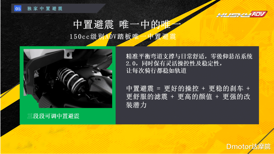 新款哈士奇150增加前置高清摄像头以及两侧示宽灯,同时也升级了动力性能;而包括150踏板唯一搭载中置减震等配置也全部延续下来。