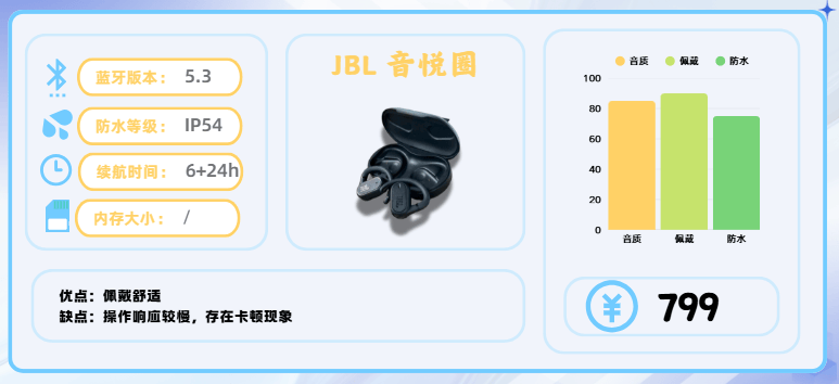 在音质方面,Soundgear Sense 配备 16.2mm 大尺寸发声单元,结合 JBL Signature Sound 的声学调校技术,呈现出 清晰饱满的中高频 和 富有弹性的低频。音色均衡自然,中频人声清晰、细节丰富,高频延展顺滑不刺耳,低频表现沉稳有力,能够适配流行、人声、电子等多种音乐类型。耳机采用 开放式发声结构与声波聚焦设计,在提升音质表现的同时,有效减少音漏干扰,即便在相对安静的环境中,也能保持舒适听感而不影响周围环境。