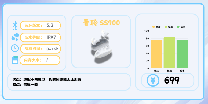 earsopen 骨聆 SS900 SE 特别款采用 独特耳夹式设计,单耳重量约 7.9 克,佩戴轻盈舒适。耳机的 U 型记忆弯臂结构能够在运动过程中稳固贴合耳部,即便在跑步、骑行等高强度运动中,也能保持相对稳定。由于其设计偏轻盈,在特别颠簸的环境下可能会出现轻微滑落,但整体佩戴体验远优于一般耳夹式耳机,不会造成夹耳疼痛或明显压迫感。