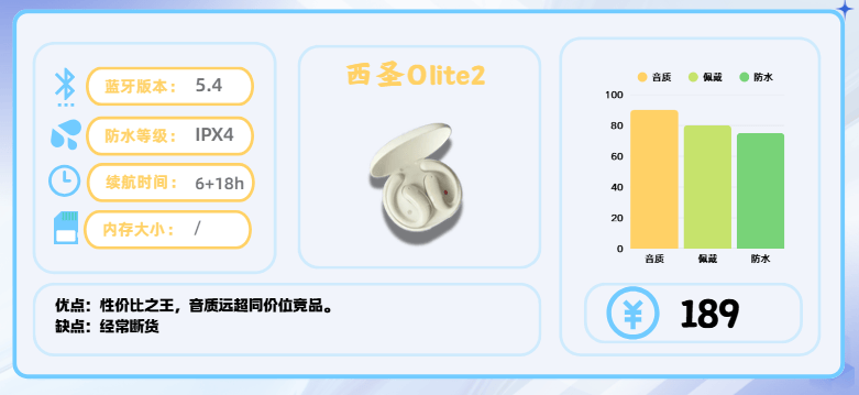 市面上不少廉价开放式耳机依旧采用硬塑料材质,佩戴时容易产生压迫感甚至耳廓疼痛。Olite2 则在舒适性上进行了突破,采用全新的 ErgoFit2.0 分段式贴耳工学设计与黄金三区支撑结构,使耳廓适配度高达 99.9%。无论不同脸型或耳型,佩戴都能稳固而不夹痛,轻盈透气,真正实现“稳而无感”。