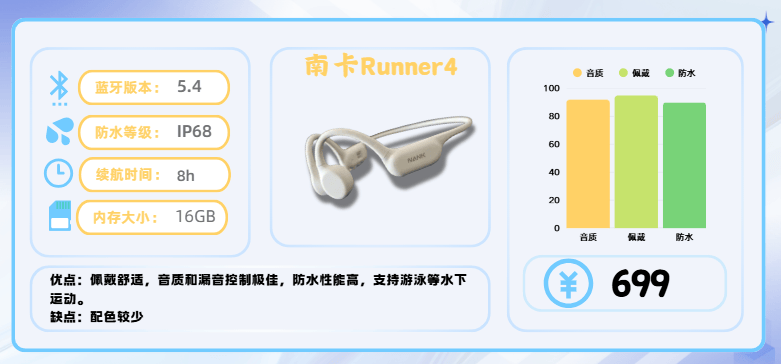 在防水性能上,Runner4 达到 IP68 级别,支持 水陆双场景使用。实测中,无论是 汗水淋漓的高强度运动,还是 短时间泳池训练,耳机均能 稳定工作,音质不受影响。南卡采用的 纳米涂层与密封工艺,为耳机提供 全方位防护,使其成为 水陆双栖运动的可靠选择。