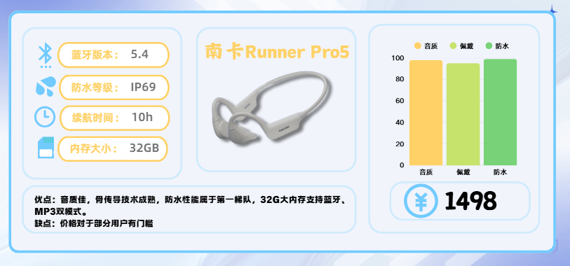 在防水性能上,Runner Pro5 更是刷新了行业标准,达到了 IP69 级别。实测中,无论是 20 分钟的热水冲澡,还是在泳池中进行长时间游泳,它都能保持稳定工作,不出现进水或音质衰减的情况。这背后得益于南卡采用的纳米涂层与超声波焊接工艺,形成了全方位的密封防护体系。对于喜欢水上运动或常在潮湿环境下锻炼的人来说,它无疑是最值得信赖的专业级选择。