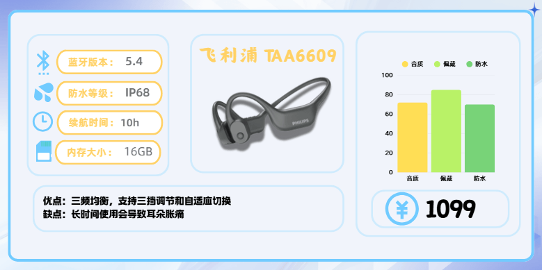 在声学方面,TAA6609 配备了 15mm 大尺寸骨传导振子,并结合圈铁混合单元技术,使得声音更加清晰自然,不会出现刺耳的高频。它在流行、摇滚、民谣等不同曲风的演绎中,对人声与乐器的还原度都比较到位,整体听感均衡舒适,能够满足日常运动和休闲场景下的音乐需求。