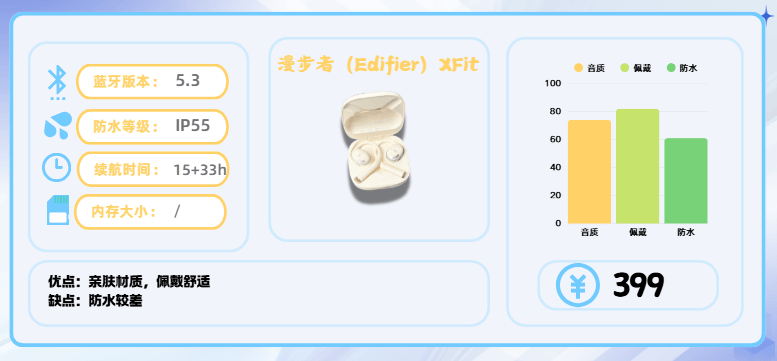 在声学方面,XFit 内置 16.2mm 超大动圈单元,并经过 Edifier 声学团队精心调校。三频表现均衡,低频富有弹性,中频人声通透,高频细节充足,整体声音层次清晰。在开放式耳机中,XFit 的音质属于中上水平,无论是流行、R&B 还是节奏感强烈的运动音乐,都能营造出良好的氛围感,让运动更有动力。